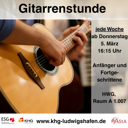 Donnerstag, 05.02.2026 Uhrzeit: 16.15 - 17.30 HWG, Raum A 1.007LU | Gitarrenstunde